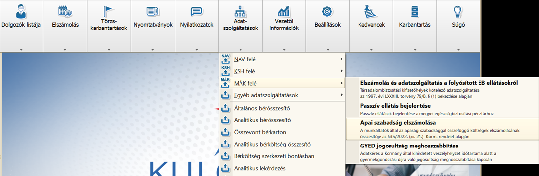 Az Apai szabadság elszámolása nyomtatványt ezt követően tudjuk elkészíteni. Ehhez válasszuk az Adatszolgáltatások/MÁK felé/Apai szabadság elszámolása funkciót.