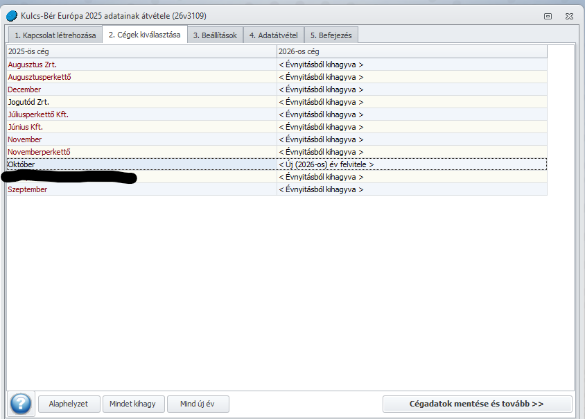 A cég mellett, a 2026-os cég oszlopban legördülő menüből lehet kiválasztani, hogy át szeretnénk-e nyitni a céget vagy sem. Ha át szeretnénk nyitni, akkor az Új (2026-os) év felvitele lehetőséget kell választani, vagy ha az adott céget már manuálisan rögzítettük a 2026. évben, akkor a listából a cég nevét kell kiválasztani.