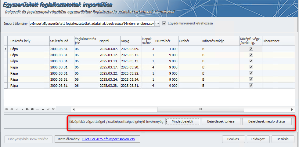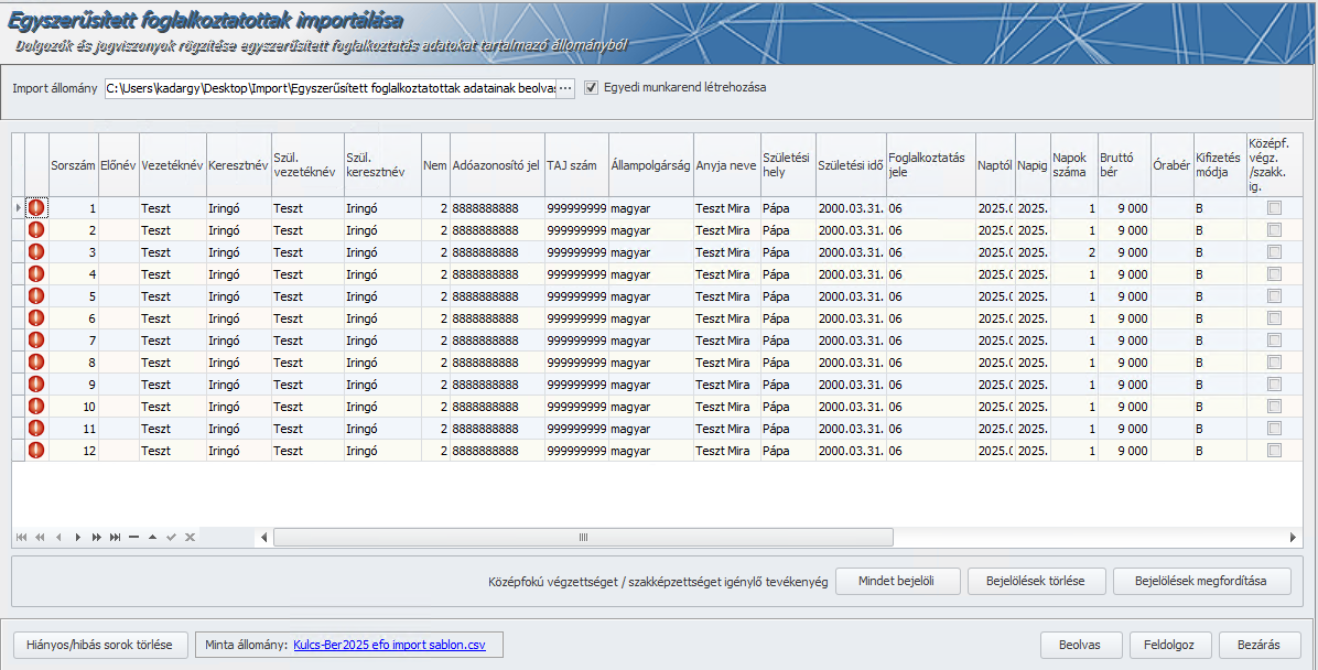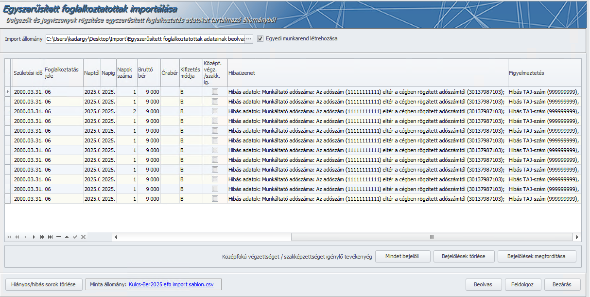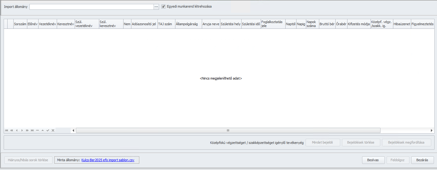 A NAV bejelentésre használt alkalmazásából (EFO-NISZ, EFO PRO) kinyerhető csv formátumú import fájl beolvasására a Karbantartás/Egyszerűsített foglalkoztatottak importálása menüpontban van lehetőség.