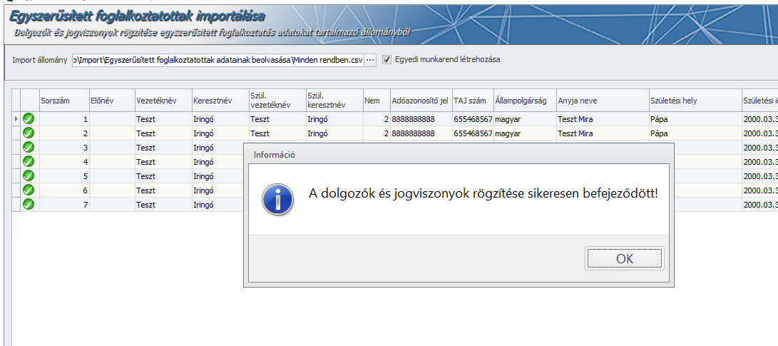 - A jogviszonyokhoz az alapértelmezett „Egyszerűsített fogl.munkarend” kerül rögzítésre. Ha ez nincs a munkarend törzsben, akkor hibaüzenet jön.