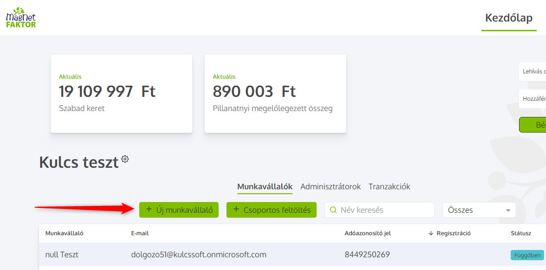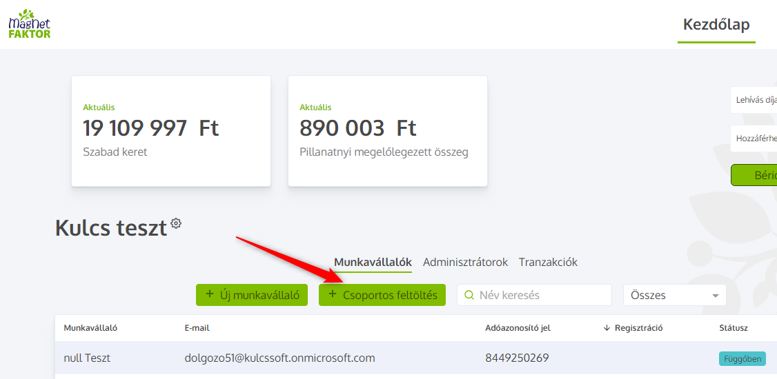 Új dolgozóknak csoportosan is ki tudjuk küldeni a meghívókat a Csoportos feltöltés gomb használatával: