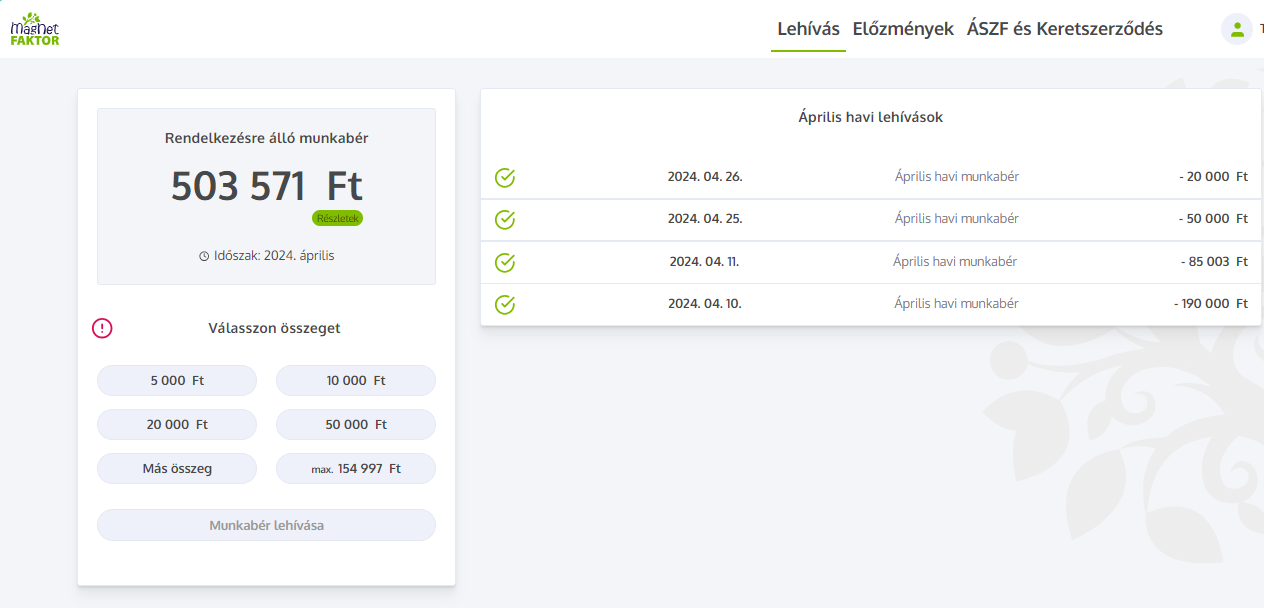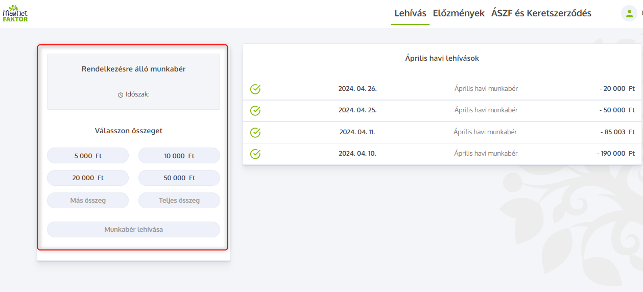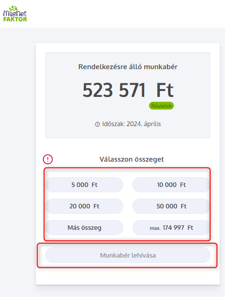 Dolgozó a felületre belépve, látja az aktuálisan elérhető egyenleget és itt tud igényelni kiutalást. A kívánt összeget megadhatja a felkínált összegre kattintva vagy kézileg megadva, majd kattintson a Munkabér lehívására: