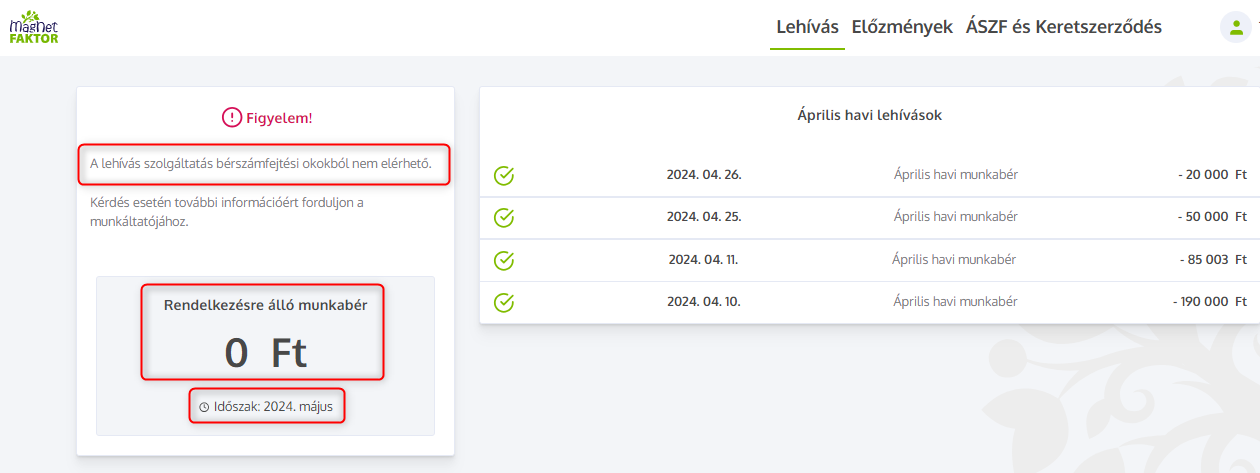 Ha az adott hónap számfejtése már megtörtént a bérszámfejtő programban, akkor a dolgozó már nem tud igényelni előleg kiutalást. Erről a rendszer tájékoztatja is a felhasználót, a rendelkezésre álló munkabére nulla forint lesz és jelzi, hogy mely hónap lesz az aminél legközelebb lehívhat előleget: