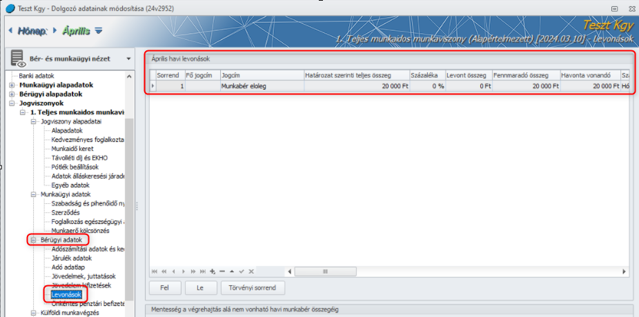 Az így a munkavállaló által indított munkabér előleg lekérés automatikusan bekerül a bérszámfejtő programba a dolgozó adatlapján a Jogviszony alapadatai/Bérügyi adatok/Levonások menüpontjába és a hóvégi számfejtésben levonásra kerül automatikusan:
