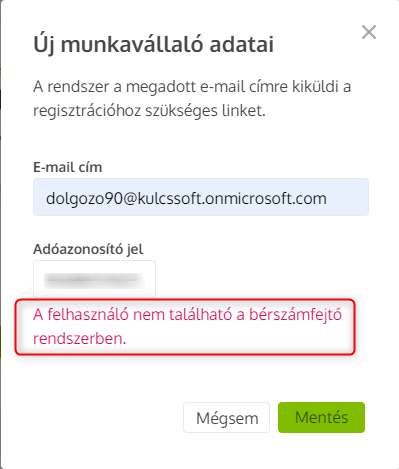 Abban az esetben, ha úgy szeretnénk meghívni dolgozót, hogy még nem rögzítettük a bérszámfejtő programba, akkor az AMBER a meghívás során üzenetben tájékoztat erről és a meghívót nem küldi el: