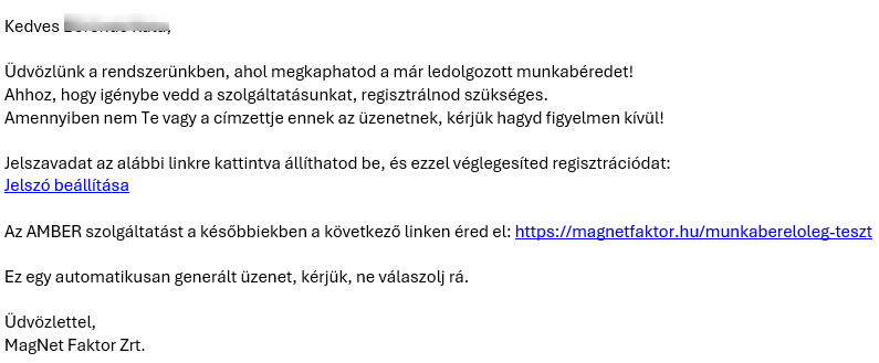 A munkavállaló a megadott e-mail címére megkapja a meghívót, azzal regisztrálja be magát a rendszerbe: