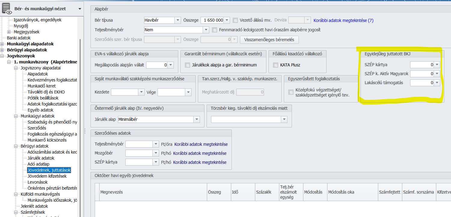 Jelen verziónktól kezdődően Új rögzítőmezőket biztosítunk a Dolgozó adatai/Jogviszonyok/Bérügyi adatok/Jövedelmek, juttatások képernyőn. Az új, "Egyidejűleg juttatott BKJ" táblarészben rögzíthető minden hónapban a számfejtést megelőzőn az ugyagyanezen időszak más foglalkoztató által juttatott béren kívüli juttatása.