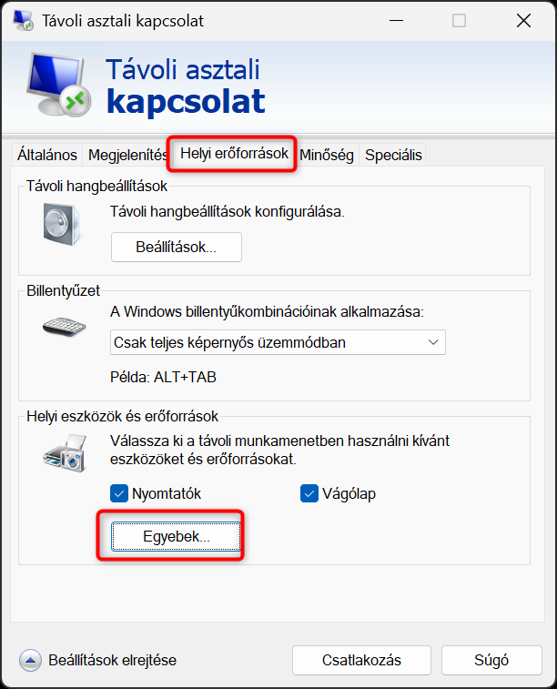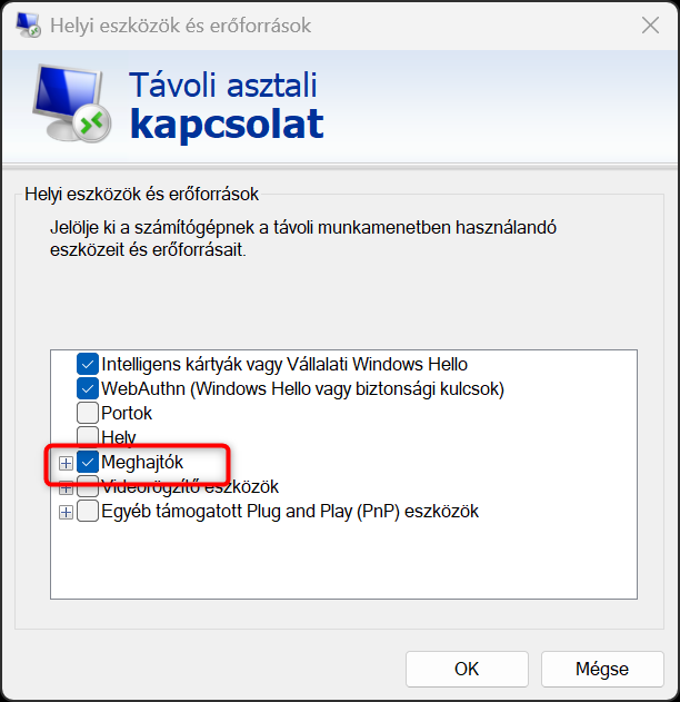 Az importálandó fájlokat másolás nélkül is be lehet olvastatni a Kulcs-Bér programmal. Ehhez az szükséges, hogy a felhőhöz csatlakozást biztosító parancsikon Helyi erőforrások szekciójában be legyenek állítva a felhasználó saját gépéről elérhető meghajtók: