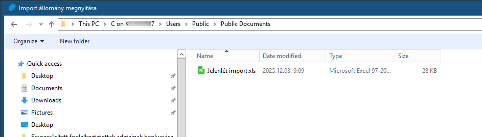Az Excelben mentett import fájlokat oda kell másolni arra az eszközre, ahol fut a Kulcs-Bér program, és az adott funkció indítása után megadni az elérési útvonalat. (Az xls vagy xlsx fájlok kiterjesztése nem módosul akkor sem, ha az adott eszközön nincs MS Office telepítve.)