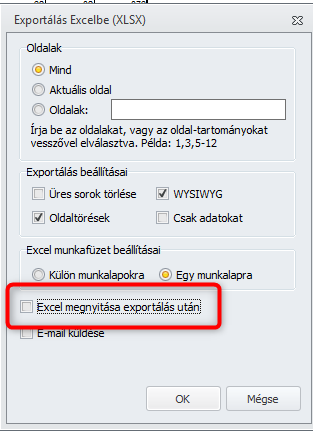 Az Excel export indítása előtt ki kell venni az Excel megnyitása exportálás után négyzetből a jelölést. Ellenkező esetben a program minden esetben elindítja a Calc alkalmazást, és azzal fog megnyílni a fájl.