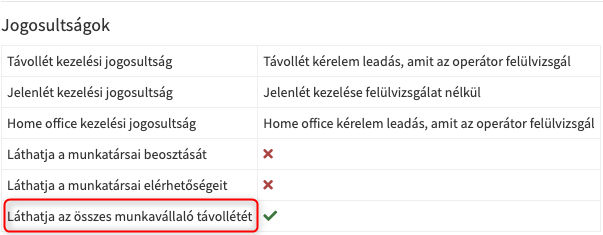 Kulcs-Beosztás: Munkavállalóknál beállítható, hogy adott dolgozó láthatja-e más munkahelyen lévő kollégái távollétes napjait