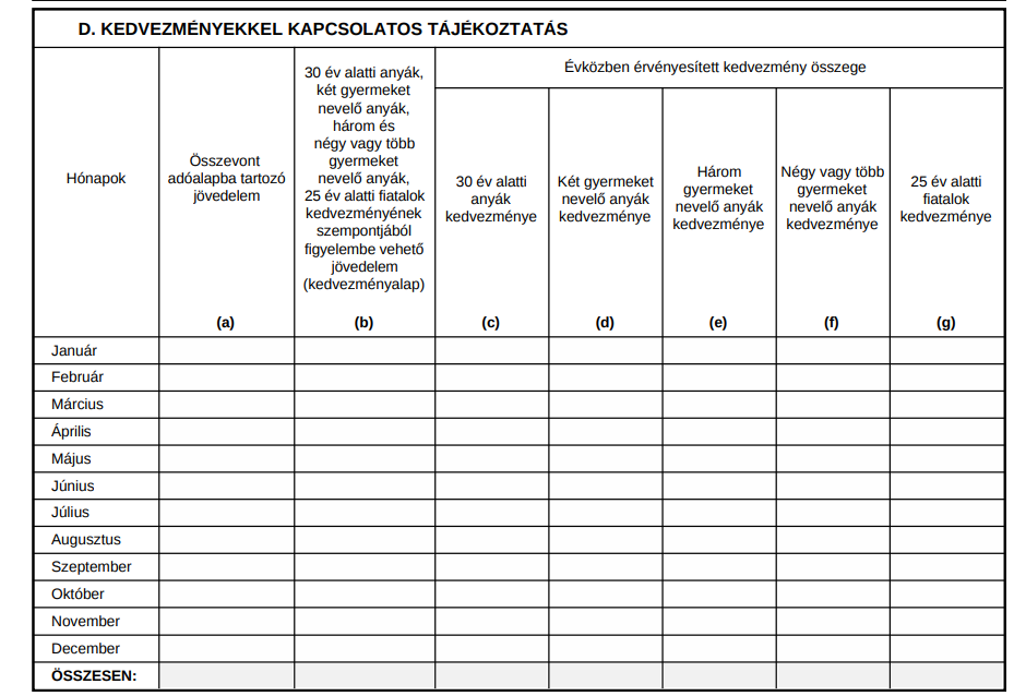 A "D" táblarész (b) oszlopába az összevont adóalapba tartozó kedvezményalapot képező jövedelmek kerülnek gyűjtésre - havi felsőhatáros kedvezmény - 25 év alattiak kedvezménye - esetén sem csökkenti ezt a program a az érvényesítési felsőhatárra, mivel utóbb a NAV részéről megerősítésre került, hogy ebben az esetben is fel kell ide gyűjteni az összevont adóalapba tartozó kedvezményalapot képező jövedelmek teljes összegét.