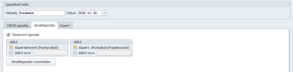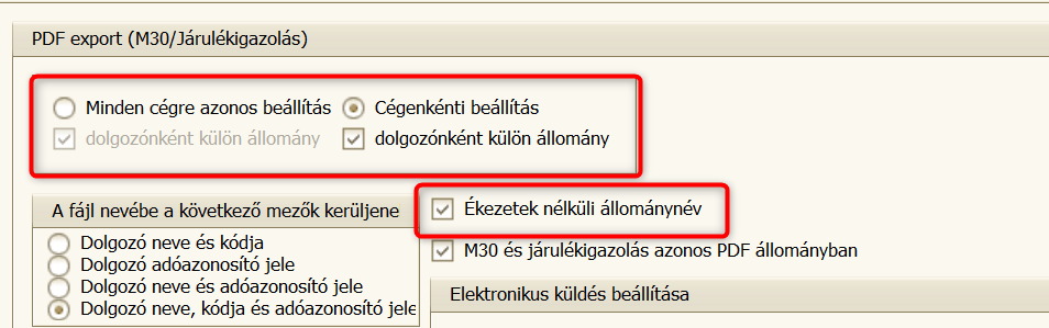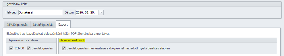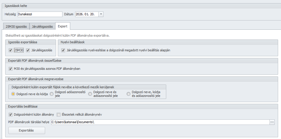 A Beállítások/Számfejtés/25M30 menüpontban be lehet állítani, hogy alapértelmezetten minden kiválasztott dolgozó igazolásai egy fájlba kerüljenek, vagy dolgozónként külön-külön, illetve, hogy az export során létrejövő fájl nevében legyenek-e ékezetek.