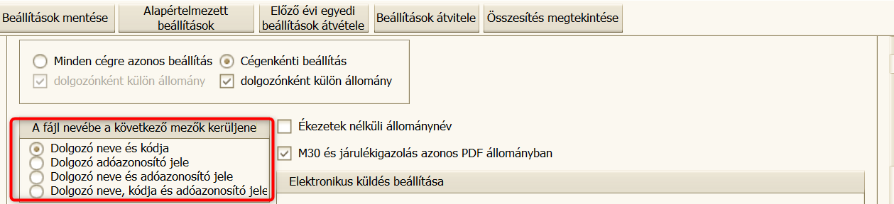 A Beállítások/Számfejtés/25M30 menüpontban meg lehet adni, hogy alapértelmezetten a dolgozónként külön expotált fájlok nevébe milyen mezők kerüljenek.