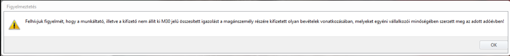 A Tovább gombra kattintva az egyedi jövedelmek beállításának ellenőrzésére az M30-as nyomtatvány összeállító felületén is megjelenítjük a figyelmeztető üzenetet.
