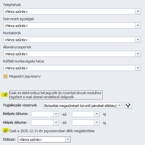 Lehetőség van azon foglalkoztatottak szűrésére is, akik rendelkeznek/nem rendelkeznek a PDF formátumú fájlok fogadásához szükséges e-mail címmel: