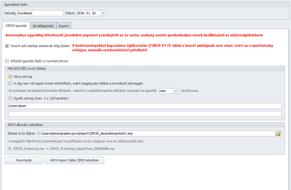 A beállító képernyő alsó részén választható ki, hogy az ÁNYK import fájlok (IMP) készítése gombra kattintva az igazolás IMP file-ként kerüljön összeállításra, és az Elérési út és fájlnév soron megadott könyvtárba mentve, az ÁNYK keretprogramba beolvasva kerüljön megjelenítésre az igazolás, vagy a Nyomtatás gombra kattintva nyomtatványként kerüljön gyűjtésre az igazolás, ami a programból közvetlenül nyomtatható, és/vagy PDF fájlként menthető.