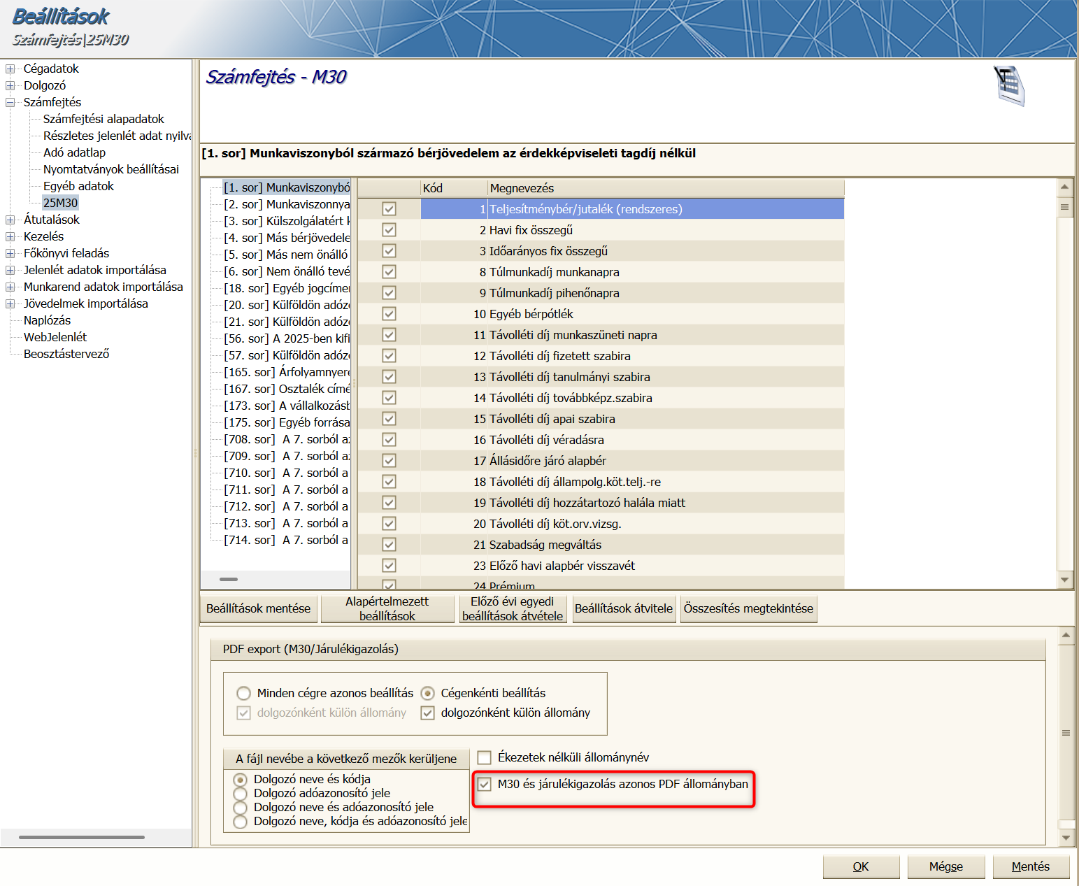 A Beállítások/Számfejtés/25M30 pont beállító képernyőjén jelölőnégyzetet biztosítunk M30 és járulékigazolás azonos PDF állományban megnevezéssel. A jelölőnégyzet alapértelmezetten bejelölt állapota mellett az M30 és a járulékigazolás azonos PDF állományba kerül gyűjtésre. Amennyiben Önök külön PDF fájlba kívánják gyűjteni az M30 igazolást és a járulékigazolást, úgy ezt a jelölőnégyzetet bejelöletlenné kell tenni.