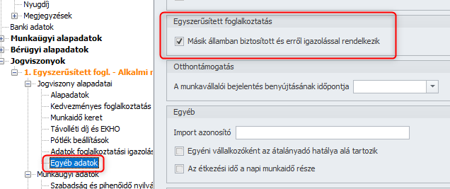 A Kulcs-Bér programban rögzíthető, ha az egyszerűsített foglalkoztatott más tagállamban biztosított. Ezt a jelölést a dolgozó adatlapján a Jogviszonyon belül az Egyéb adatok menüpontban tudjuk jelölni. Ennek jelölése automatikusan átadásra kerül a T1042E nyomtatvány 23. pótlap 4. sorába.